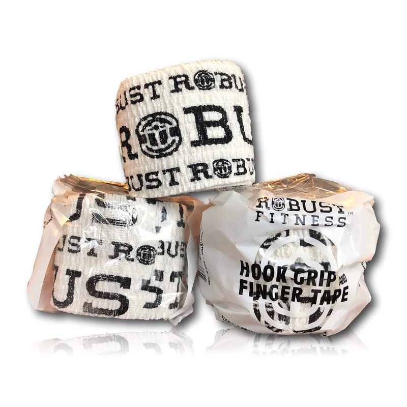 ROBUST FITNESS Weightlifting Hook Grip Tape | Adhesive Stretch Athletic Thumb & Finger Tape | Sticky, Stretchy, Flexible, Easy Tear | Olympic Weightlifting | Cross-Training (3 Rolls, White/Black)