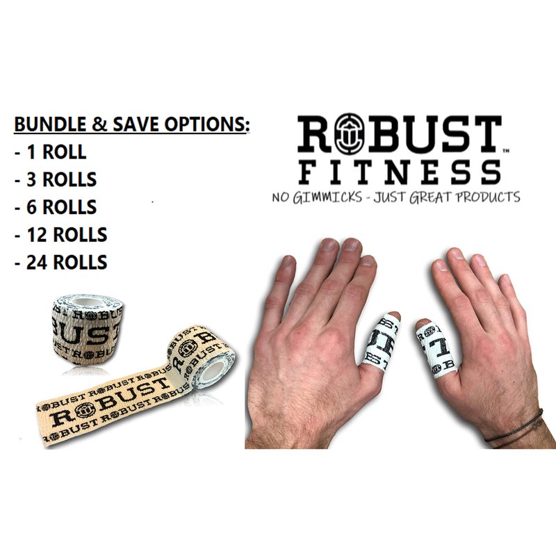 The ROBUST FITNESS weightlifting tape is a resilient stretch athletic tape with a premium adhesive, perfect for Cross-Training, functional fitness, Olympic weightlifting, Power-lifting, Strongman, gymnastics and more. Our special blend of fabric and adhesive ensures that our flexible grip tape delivers the ultimate instinctive grip and hand protection needed during the most intense workouts. Use our stretchable hook-grip tape to protect your thumbs while you hook grip, as well as an excellent coat of protection for your fingers. Cuts and rips during weightlifting reduce performance, lead to worse cuts and infections, and boost the probability of injuries that could trigger significant healing period. Furthermore, conventional inflexible athletic tape constrains the blood flow in your fingers and restricts the natural movement of your fingers. ROBUST FITNESS tape is specially constructed as a dynamic weightlifting tape. ROBUST FITNESS hook grip tape will quick to transform the way you tape-up, not only for your daily WODs, but also during competitions when it matters the most. Hit new PRs, stay in the game longer and lift with full confidence knowing your hands are shielded and ready with superior grip tape.