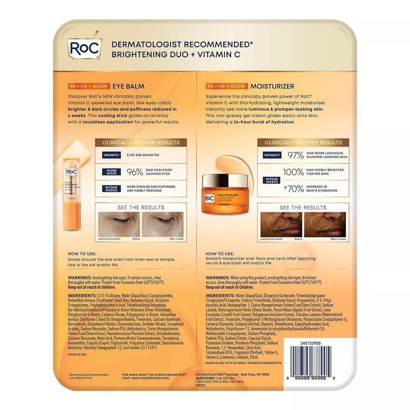 Revive + Glow Eye Balm: 90% saw brighter eyes with our clinically proven, Vitamin C-powered eye balm. RoC’s patent-pending complex of brightening Vitamin C and firming peptides visibly reduces dark circles and puffiness. This cooling stick glides on invisibly with a touchless application for powerful results: In 1 week, 96% saw healthier-looking eyes, and in 4 weeks, eyes appeared brighter with dark circles and puffiness visibly reduced. Revive + Glow Moisturizer: Instantly see luminous and plumper-looking skin with this lightweight moisturizer. This non-greasy gel cream glides easily onto skin, delivering a 24-hour burst of hydration. In 4 weeks, 100% of women had brighter, tighter skin. Experience the clinically proven power of RoC Vitamin C formulated with a patent-pending 10% Vitamin C blend. The results are an instant glow, a more even skin tone & visibly reduced lines and wrinkles over time.