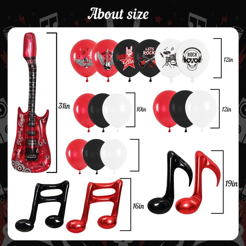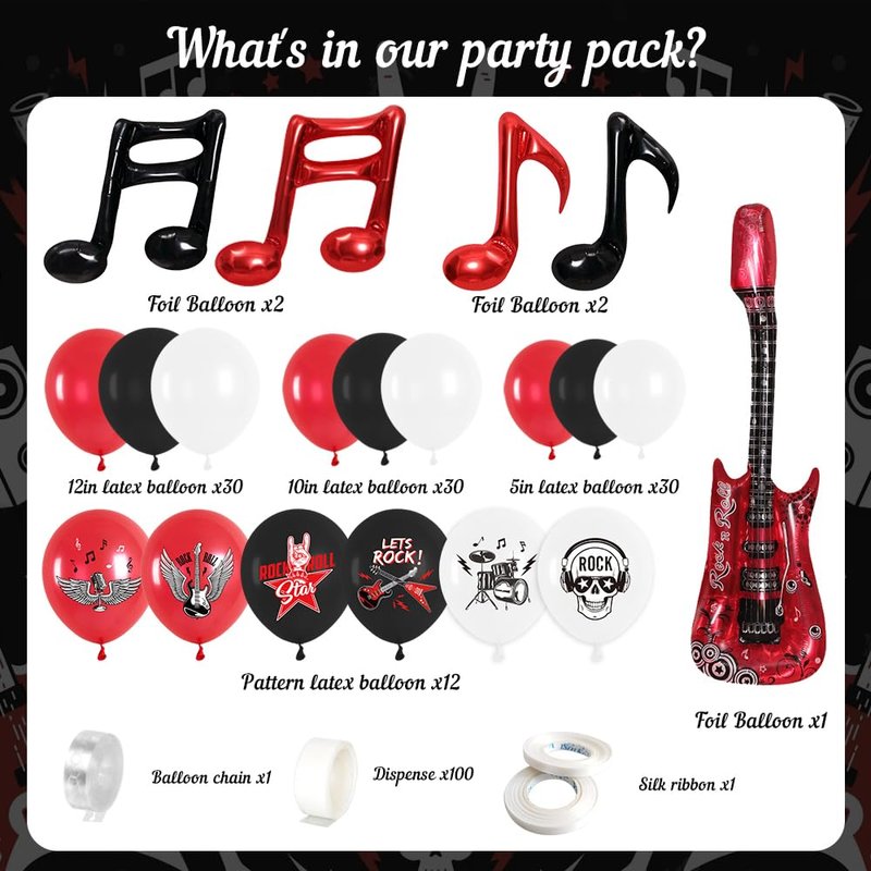 - Rock and Roll Party: Rock and roll music balloon includes 102 latex balloons, 4 music note foil balloons, and 1 guitar balloon. This complete package is suitable for creating an electrifying atmosphere at your party