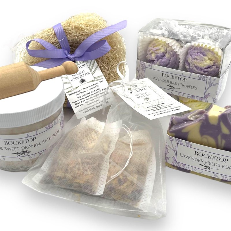Rock the Top USA Made | 6 Lavender Self Care Gifts for Women, Bath Bombs (Truffles), Plant Based Dry Brush Body Brush Loofah, Epsom Salt Bath Soak, Handmade Soap, Herbal Bath Tea, Self Care Gift Box.