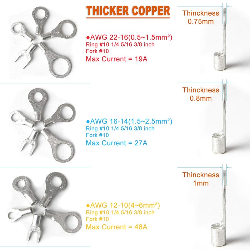 - Material: The non-insulated ring/fork terminals are made from 99.9% pure copper, the tin plated helps resist corrosion and it also makes them easy to solder.