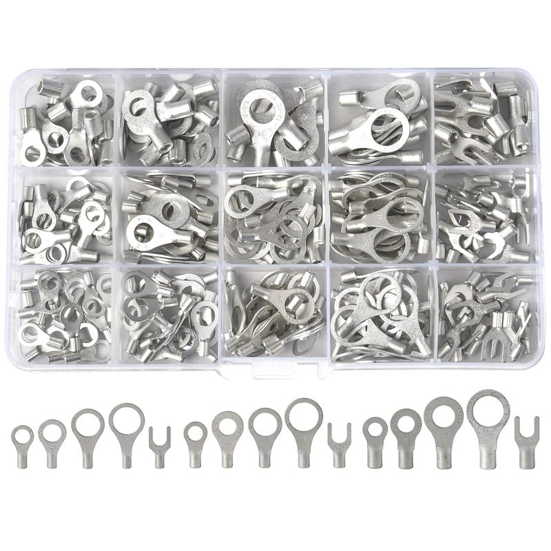 The ring/fork terminals are used to attach wires to studs or posts, and come in a variety of types and sizes. Non-insulated ring terminals can be crimped or soldered and can be easily finished off with heat shrink tubing to insulate and protect the connection. Material: 99.9% pure copper; Finsh: Matte tin plated; Rated temperature: 221°F (105°C); Rated voltage: 600 volts. Package: RNB1.25-5(AWG 22-16 * Ring #10) --- 20pcs; RNB1.25-6(AWG 22-16 * Ring 1/4") --- 20pcs; RNB1.25-8(AWG 22-16 * Ring 5/16") --- 20pcs; RNB1.25-10(AWG 22-16 * Ring 3/8") --- 20pcs; SNB1.25-5(AWG 22-16 * Fork #10) --- 20pcs; RNB2-5(AWG 16-14 * Ring #10) --- 20pcs; RNB2-6(AWG 16-14 * Ring 1/4") --- 20pcs; RNB2-8(AWG 16-14 * Ring 5/16") --- 20pcs; RNB2-10(AWG 16-14 * Ring 3/8") --- 20pcs; SNB2-5(AWG 16-14 * Fork #10) --- 20pcs; RNB5.5-5(AWG 12-10 * Ring #10) --- 15pcs; RNB5.5-6(AWG 12-10 * Ring 1/4") --- 15pcs; RNB5.5-8(AWG 12-10 * Ring 5/16") --- 10pcs; RNB5.5-10(AWG 12-10 * Ring 3/8") --- 10pcs; SNB5.5-5(AWG 12-10 * Fork #10) --- 10pcs;Total: 260pcs.