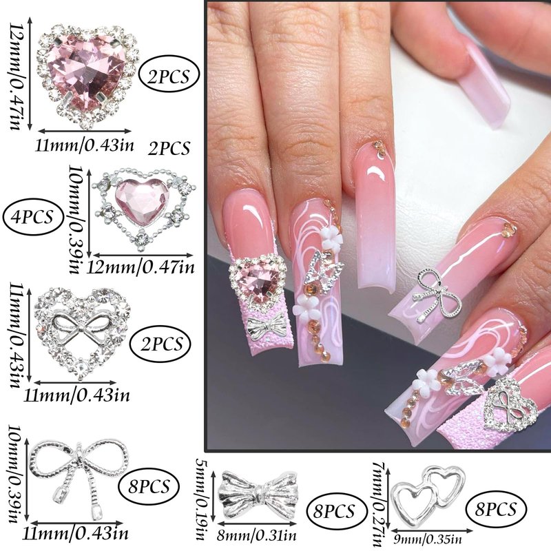 - Safe Material:These heart nails rhinestone are made of high quality alloy, silver metal base with inlaid crystals rhinestonesm,looking shiny and bling,not easy to break or fade,making your nails look brighter,and will not burden your skin or cause discomfort, so they can be applied for a long time.