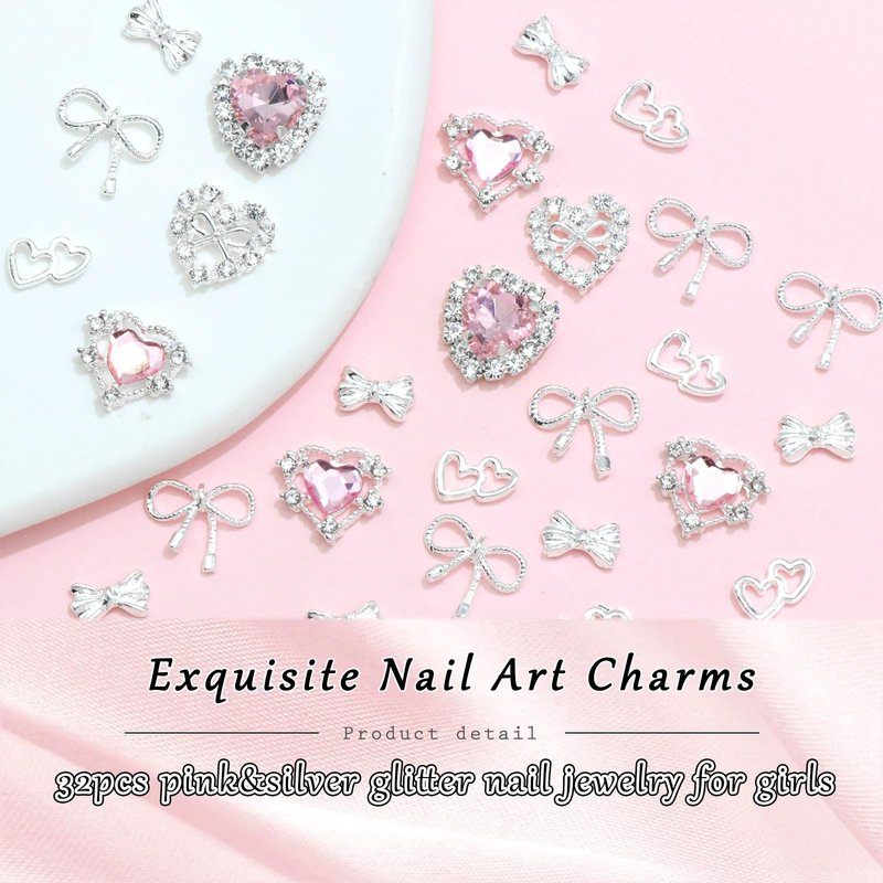 RODAKY 32PCS Bow Nail Charms 3D Silver Heart Shape Nail Art Charm with Pink Rhinestone Valentine's Day Y2K Nail Gems Shiny Nail Jewelry Acrylic Accessories for Women Nail Decorations