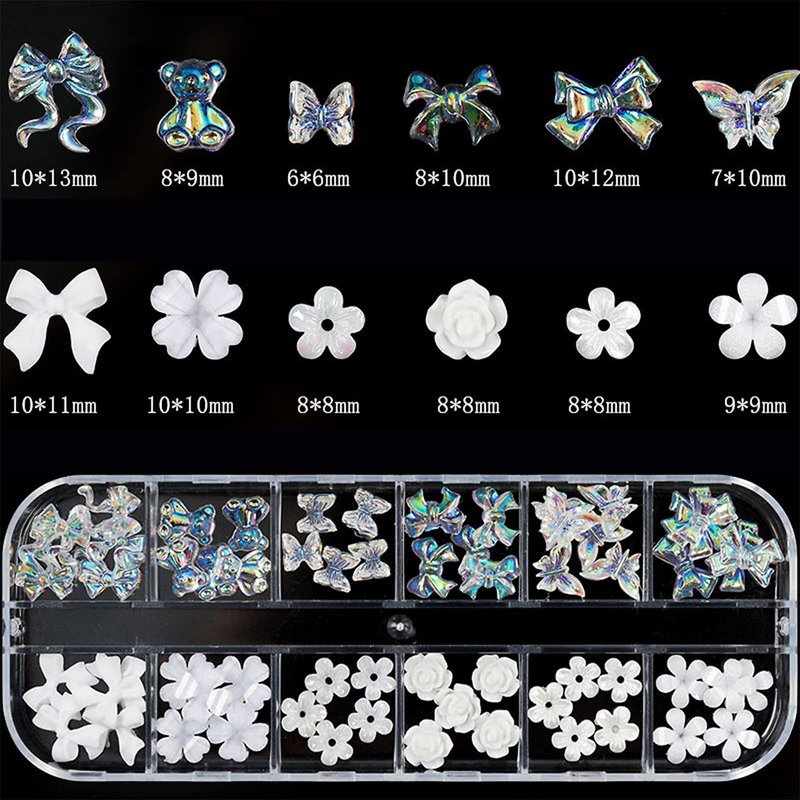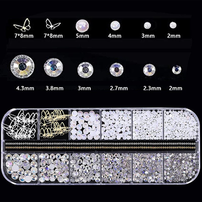 - 3D Nail Charms:Package Included 2 box Nail Gems 3D Nail Decorations Set:1 Box are Flatback AB Nail rhinestones and Pearl Metal Buutterfly,1Box are 3D Nail Charms Flower Butterfly Bowknot Nail Charms,1 Crayons and 1 Tweezers