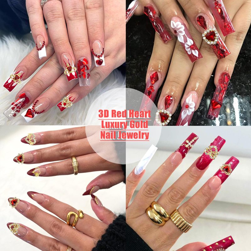 - Exquisite&Stylish:Each style charms are in unique and beautiful design.Gold metal base inlaided with shiny red crystal rhinestone.The combination of heart and floral design can make your nails art more charming and attractive.