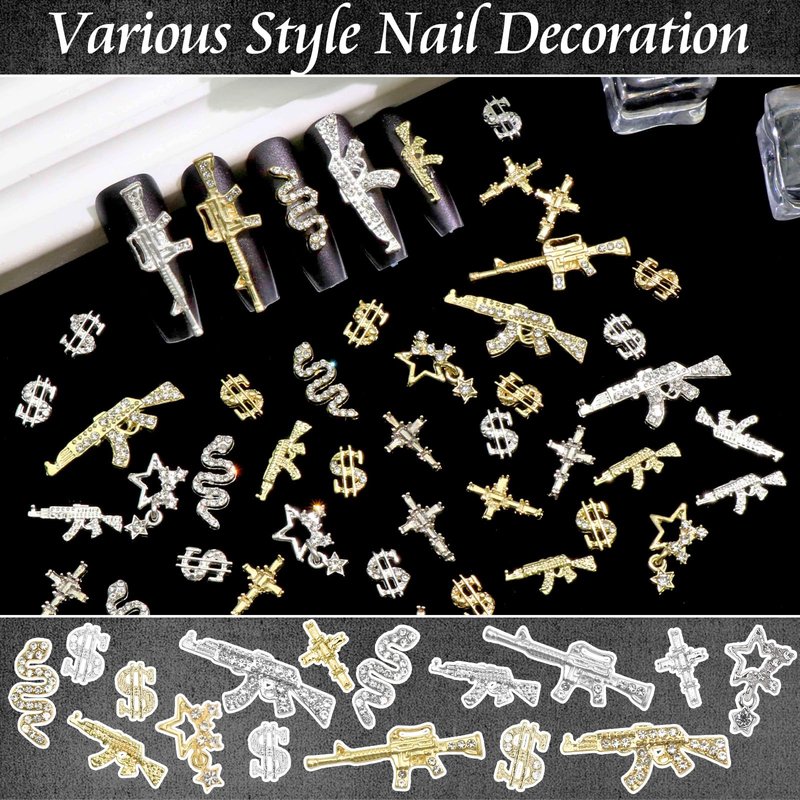 Nail jewelry in various shape,including 3d gun,snake,dollar,cross and more,allows you to match them to different style nails art,so you can have more fun manicure diy experience.