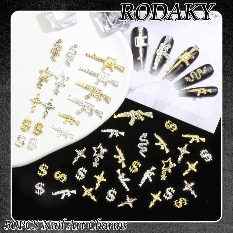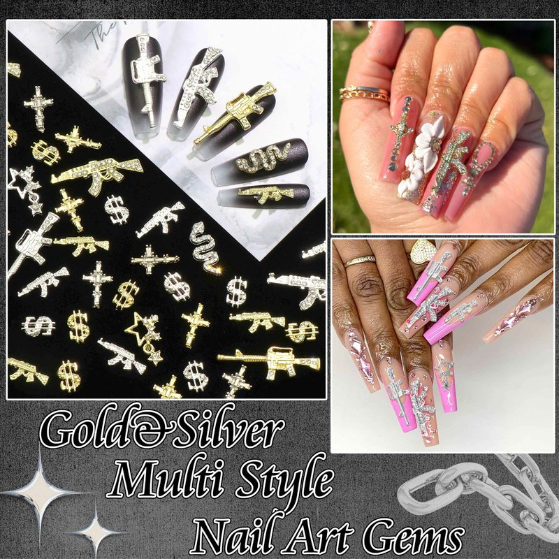 RODAKY 50PCS Gun Nail Charms 3D Cross Nail Art Jewelry Gold Dollar Sign Charms for Nails Multi Style Nail Gems for Women Manicure Snake Charms Nail Decoration Craft Accessories