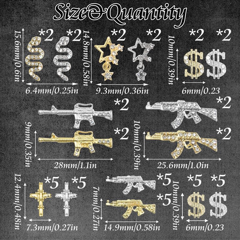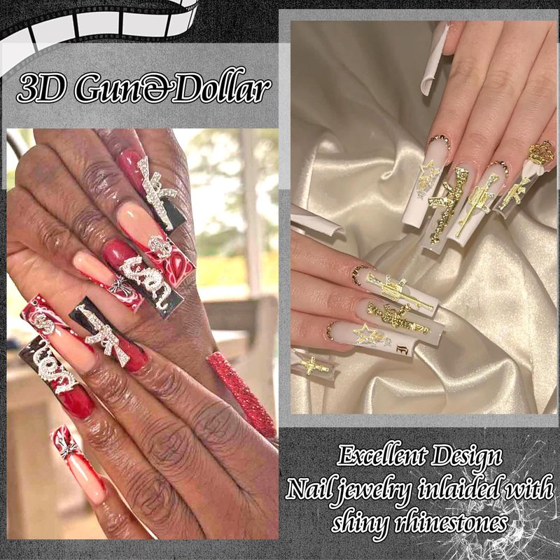 - Various Design:The dollar nail charms,gun and star nail decoration are made of metal alloy base and studded with sparkling crystal rhinestones.The surface of each style charms has excellent design,looking delicate and unique in style.