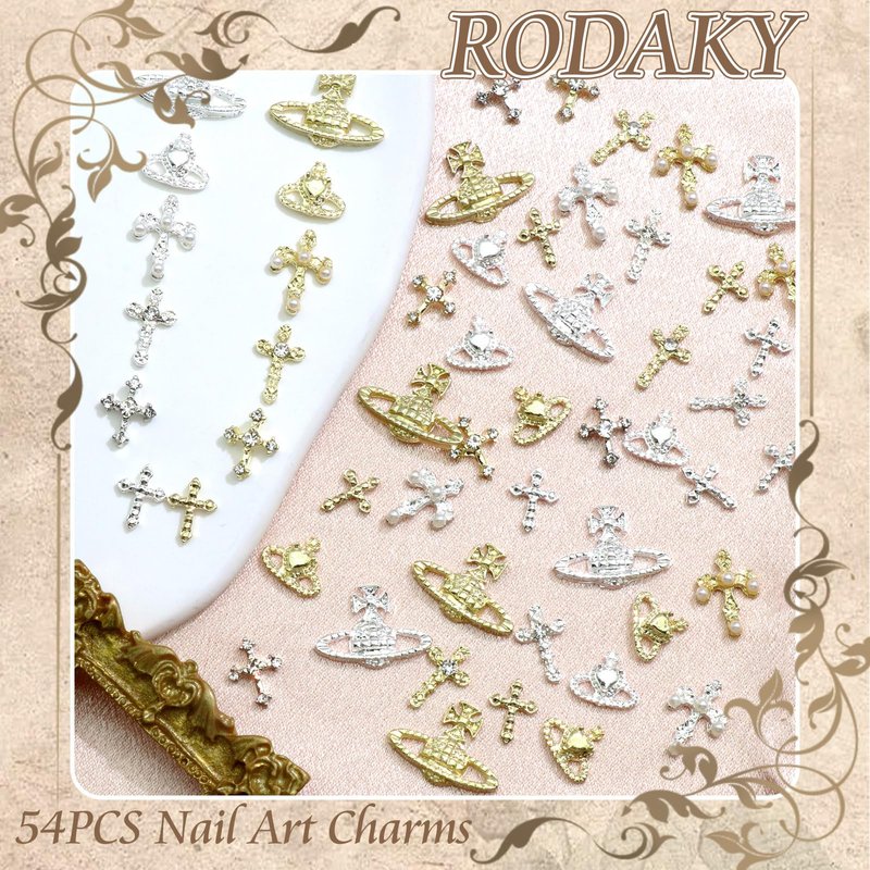 RODAKY 54PCS Cross Nail Charms Gold Cross Charms for Nails 3D Planet Nail Art Jewelry Silver Nail Charms and Gems Metal Nail Stud Rhinestones Shiny Nail Decoration for Manicure Design