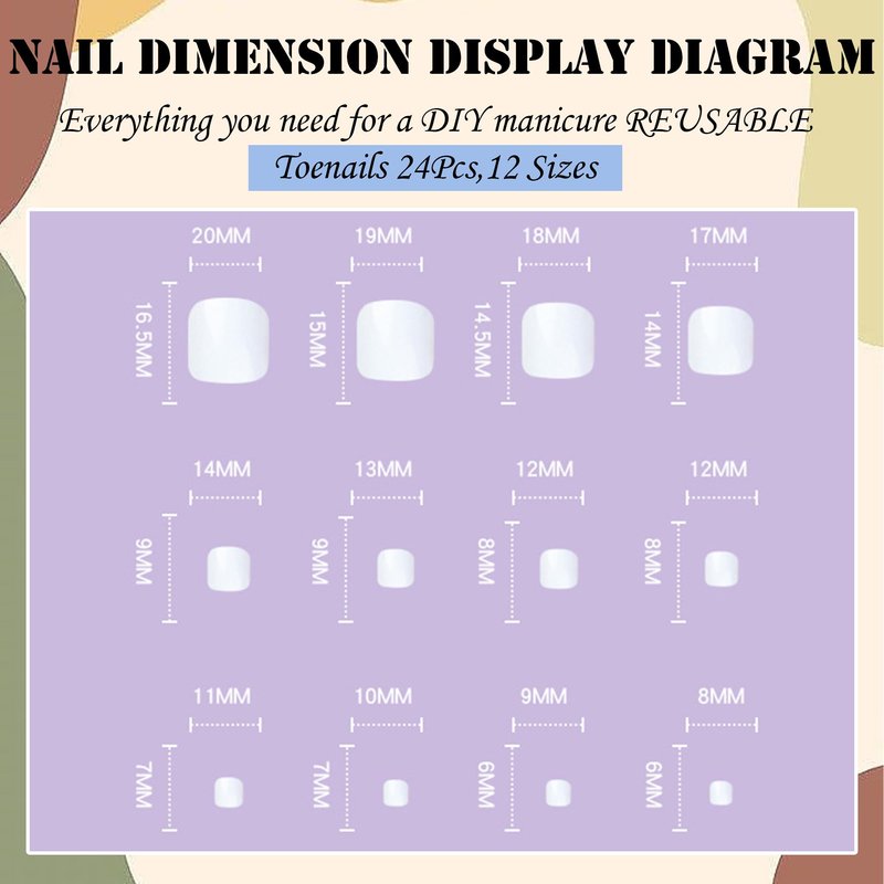 - Packing: The False Toenail Kit Has 24 Fake Toenails, 12 Different Sizes Of Nails, 1 Double-Sided Sticker And Nail File.