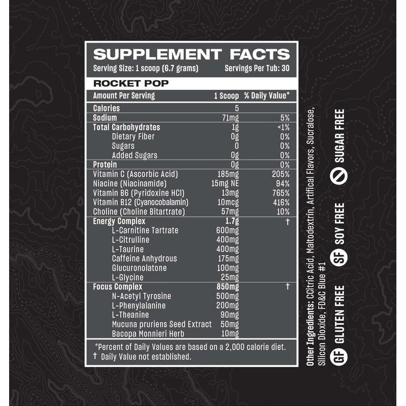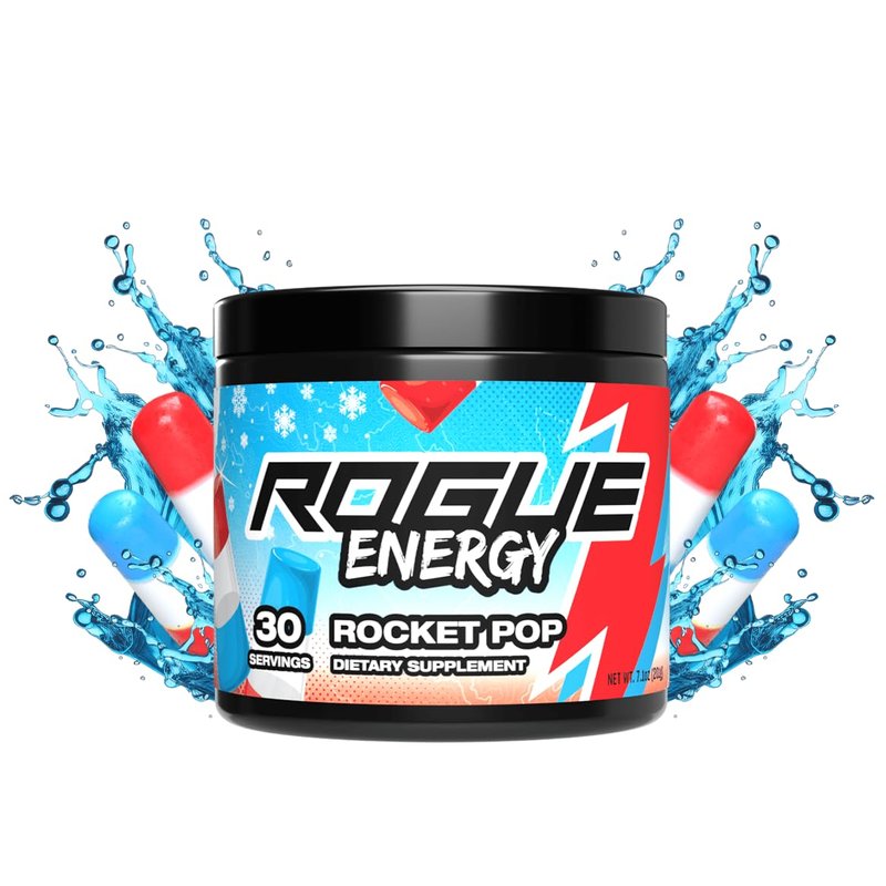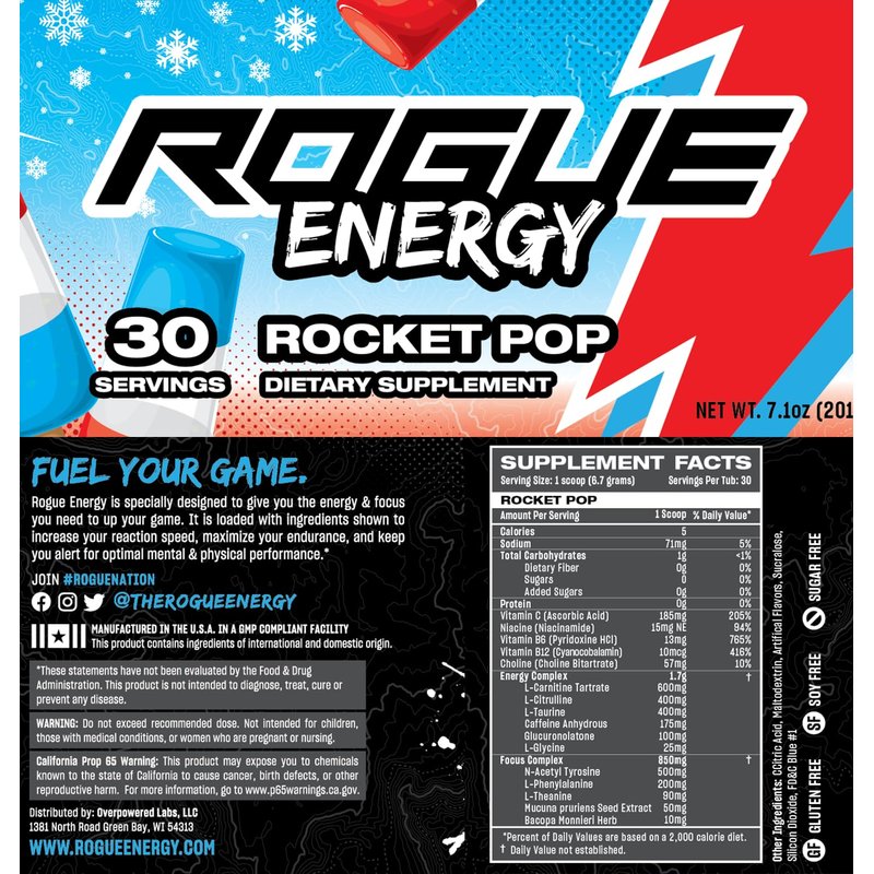 Flavor Name: Rocket PopTotal Calories: 5Total Servings Per Tub: 30Sugar: 0Other Ingredients: CCitric Acid, Maltodextrin, Artifical Flavors, Sucralose, Silicon Dioxide, FD&C Blue #1π πππ§π’πππ«π§π₯ππ‘ ππ₯ππ, π¬ π¦π¨πππ₯, π π©ππ§ππ ππ‘π¦, πππ¨π§ππ‘ ππ₯ππ, ππ¬π¬% π©ππππ‘, π πππ ππ‘ π¨π¦πGet ready to amp up your gaming experience with Rogue Energy's Rocket Pop energetic drinks. Energize powder drink is like your secret weapon for those marathon gaming sessions. Each scoop is packed with stuff that keeps you going, like caffeine and many other energy boosters. Our energy powder mix helps you stay super focused and supported. With caffeine anhydrous, N-Acetyl Tyrosine, L-Theanine, and L- Phenylalanine, you'll enjoy sustained energy without the crashThis energy drinks powder is totally sugar-free, so you won't crash and burn in the middle of your gaming spree. Plus, it's gluten-free, our energy powder is perfect for people who can't do gluten. Whether you're gaming late into the night or need a boost for work or study, this energy support has your back. And it's made for anyone who wants to feel sharp and alert, not just healthy gamers.With Rogue Energy, you get a big tub of energy drinks sugar free powder that lasts a while. Enriched with essential vitamins C, B6, and B12, each serving not only boosts your energy but also supports your overall well-being. Experience enhanced alertness and mental clarity as you tackle every challenge with morning energy drink powder. Plus, with Rogue Energy's commitment to quality and safety standards in the USA, you can trust in the reliability of every scoop. Join the gaming revolution with multi-flavored gaming supplements and power up with Rogue Energy, proudly made in the USA!