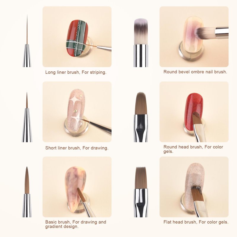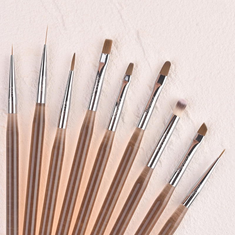 The set includes nine different brushes, including long striping brush, short striping brush, flat brush, round brush, rounded angled brush, and basic brush, catering to all your needs in nail art design. It is not only suitable for beginners in nail art but also highly recommended for professional nail studios.