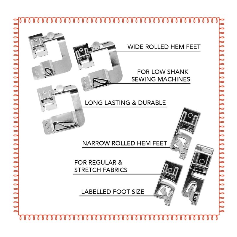 - FOOT FOR ALL – No longer search for the ultimate pants hemmer. Our presser foot set comes in 6 sizes - 3pcs wide rolled hem foot [0.5in, 0.75in, 1in] and 3pcs narrow sewing machine foot hemmer [3mm, 4mm, 6mm].