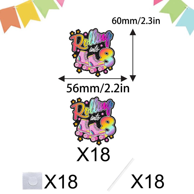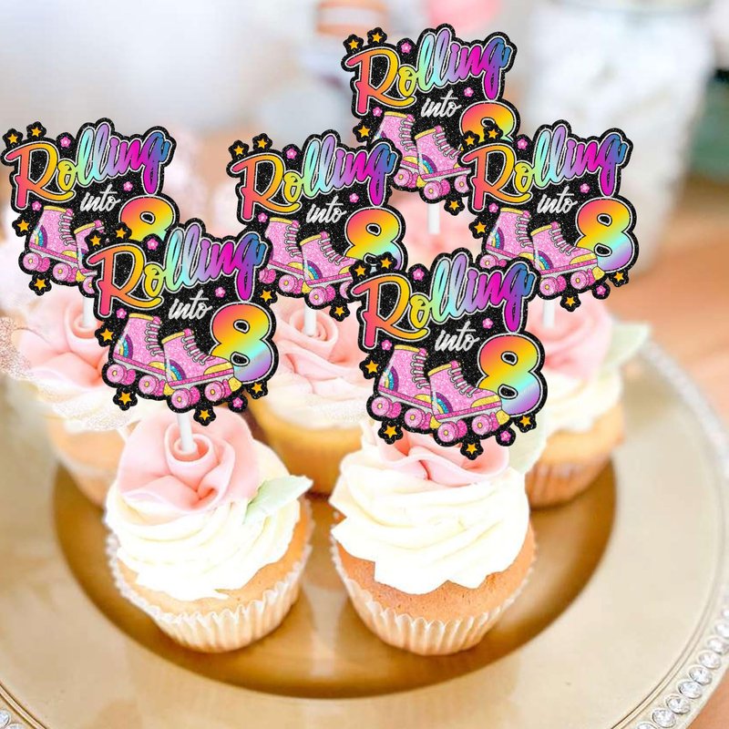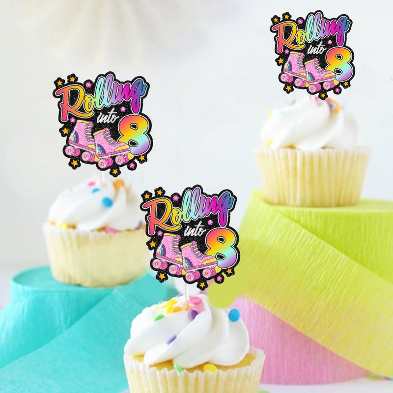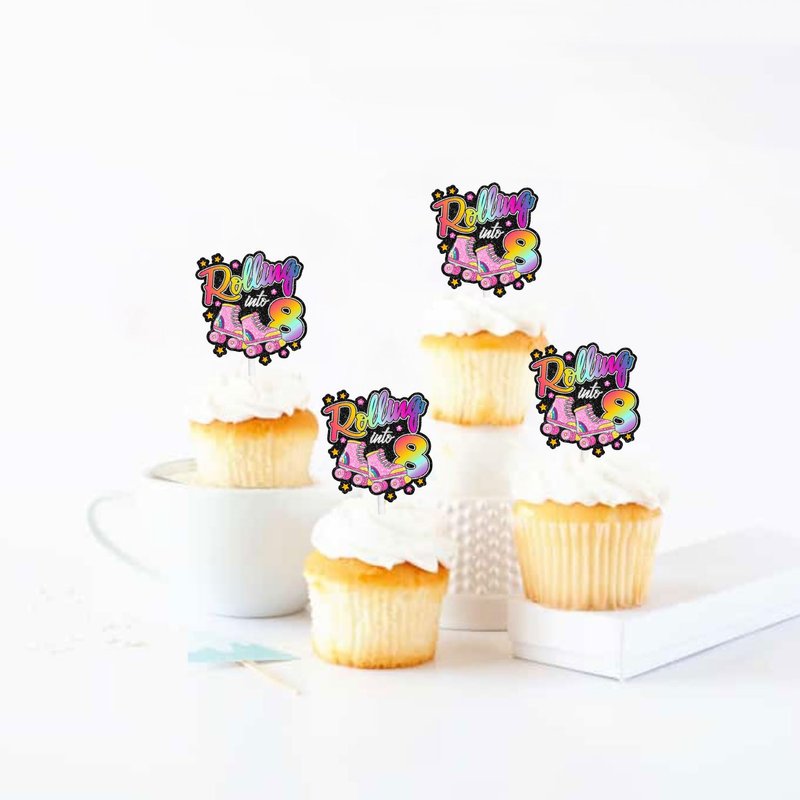Roller Skate 8th Birthday Cupcake Toppers 18-PC Set - Lovely Roller Skate Themed Birthday Party, Retro Roller Skate Themed Party, or Disco Ball Party Decoration for Boys or Girls - LIANGSS