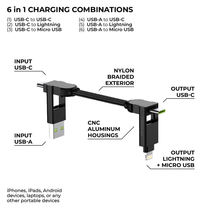 - Unique Design: This universal cable cord connector has 6 different types of cable inputs/outputs and offers all the connectivity possibilities you'll ever need: USB to USB-C, USB to Lightning, USB to Micro USB, USB-C to USB-C, USB-C to Lightning and USB-C to Micro USB