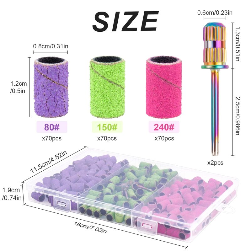 Rolybag Sanding Bands for Nail Drill Sanding Bands#80#150#240 Grits 210Pcs Color Coarse Fine Nail Sanding Bands 2Pcs Nail Drill Bits 3/32" Mandrel Bits Portable Storage Box Set