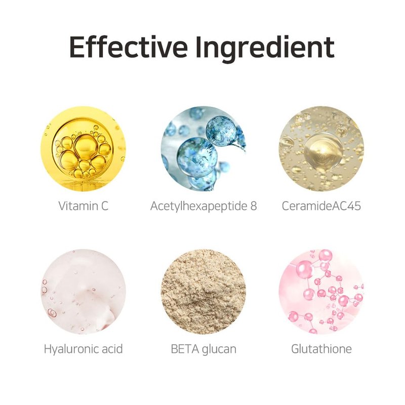 - Vitamin C. It has a skin tone-up, pigmentation prevention, and gloss effect, and has the effect of antioxidant, wrinkle prevention, blemish, and acne marks removal.