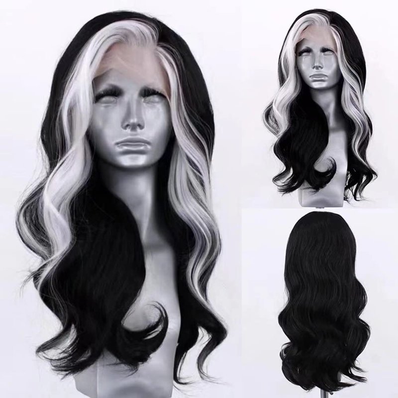 RONGDUOYI RDY Black Mix White Highlight Wig for Women Pure Black with a White Front Streak Lace Front Wigs 26inches Long Body Wave Synthetic Wig with Natural Hairline