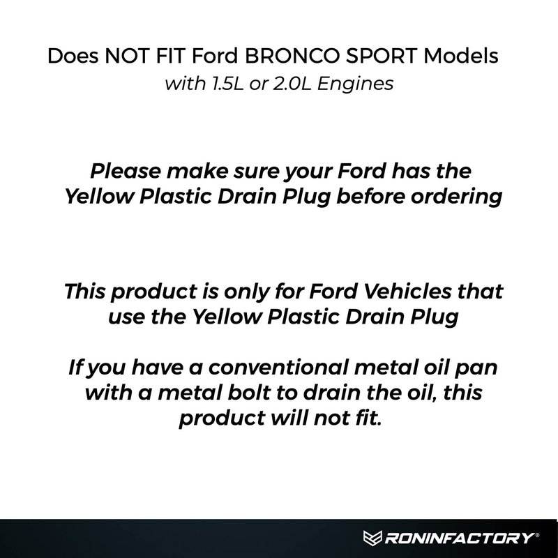 - PLEASE CHECK - Please check to make sure your Ford vehicle has the Yellow Plastic Drain Plug as shown in the image. If your vehicle does not have the yellow plastic plug, this product will not fit. Does not fit 1.5L, 2.0L or 2.3L 4 cylinder engines