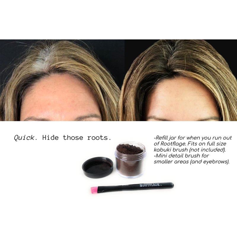 Rootflage refill jar HIDE THOSE ROOTS! – Rootflage temporary root touch up powder instantly, quickly, and easily camouflages your light, dark or gray roots to blend in with your hair color between salon visits, while volumizing and adding body. EASY TO APPLY HAIR COLOR TOUCH UP – 30 seconds to help keep roots looking flawless. The unique Rootflage applicator is specially designed for hair, so you get great results without any mess. This is the best fill-in root touch up available. TEMPORARY HAIR COLOR – Gray hair cover up, dark or light roots. Saves time and money between salon visits. Helps extend time between salon appointments. Helps extend time between shampoos. ABOUT 60 APPLICATIONS PER BOTTLE – Each .31 oz base jar has approximately 60 applications and comes with a a Detail Brush for precise applications