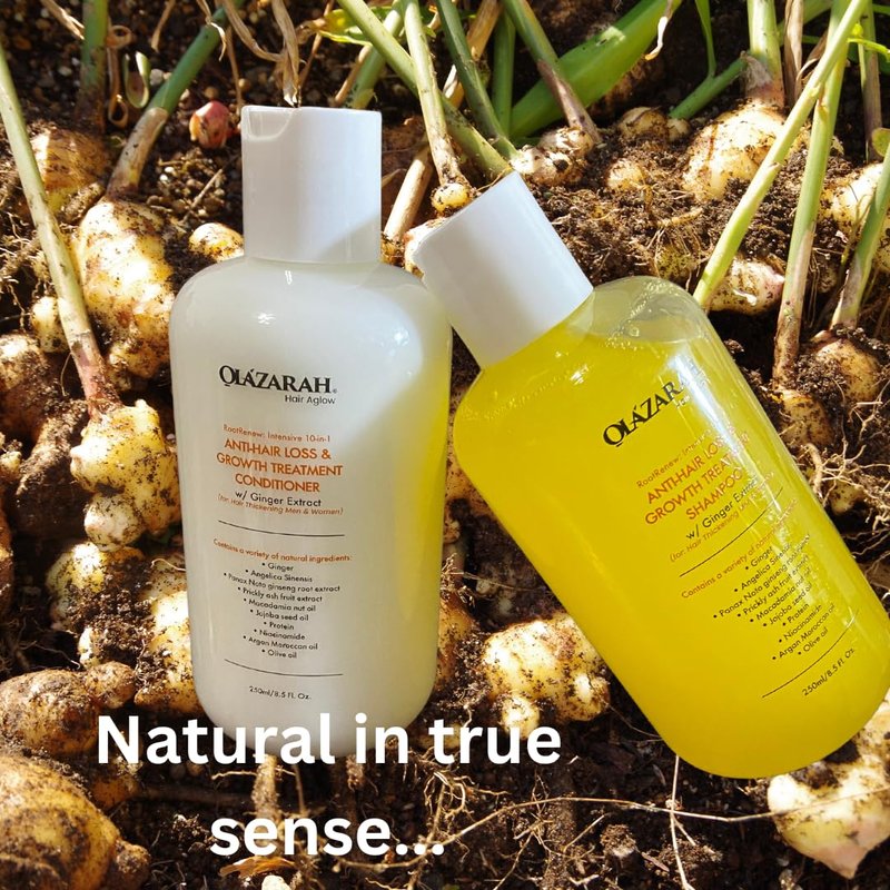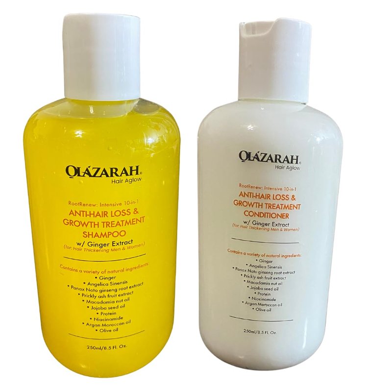RootRenew Intensive 10-in-1 Anti-Hair Loss & Growth Treatment Shampoo and Conditioner enriched with potent Ginger Extract is a powerful combination designed for both men and women seeking to combat hair loss and promote hair thickening. Infused with the rejuvenating properties of Ginger Extract, this dynamic combination provides comprehensive hair care, addressing a multitude of hair concerns in one convenient package. It is suitable for luscious, resilient hair that exudes confidence and strength to stronger, fuller, and healthier looks. RootRenew is your key to unlocking the beauty of resilient, voluminous hair, and it's now available at your fingertips.