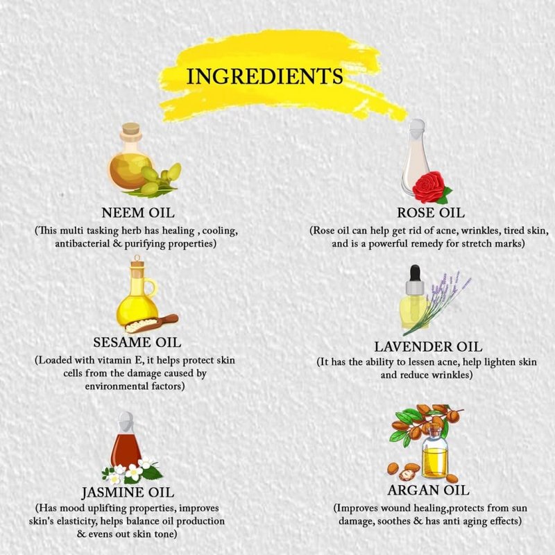 Ingredients: Neem Oil, Coconut Oil, Sesame Oil, Rose Oil, B.H.T., Lavender Oil, Geranium Oil, Jasmine Oil, Carrot Oil.