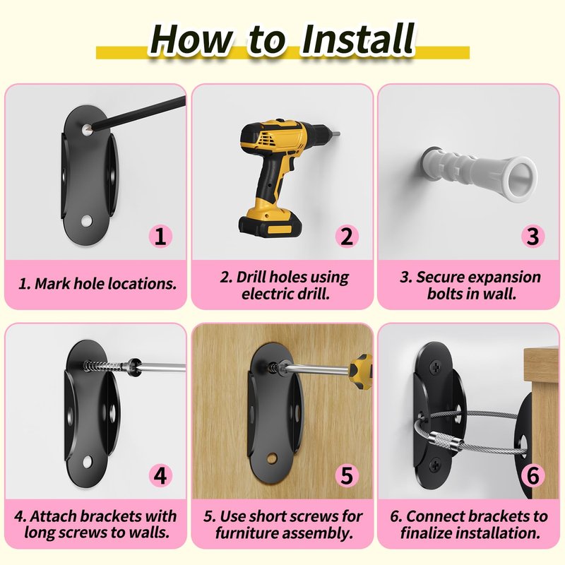 - Easy Installation: Achieve dresser and large furniture security within minutes using our user-friendly anti-tip furniture straps. Follow the provided instructions, employ the included hardware, and effortlessly install using a screwdriver and drill driver. Opt for vertical or horizontal mounting, potentially saving a life.