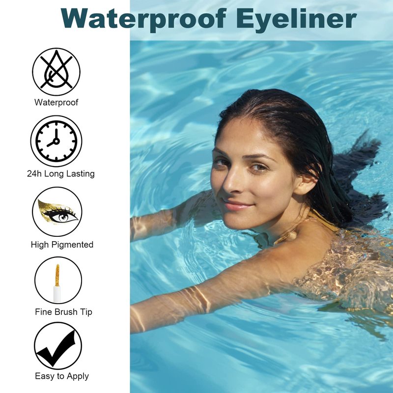 - [Long Lasting & Waterproof]: Gold glitter eyeliner with a waterproof formula, without sticky, smudging, the gloss is smooth and stable, lasting for whole day