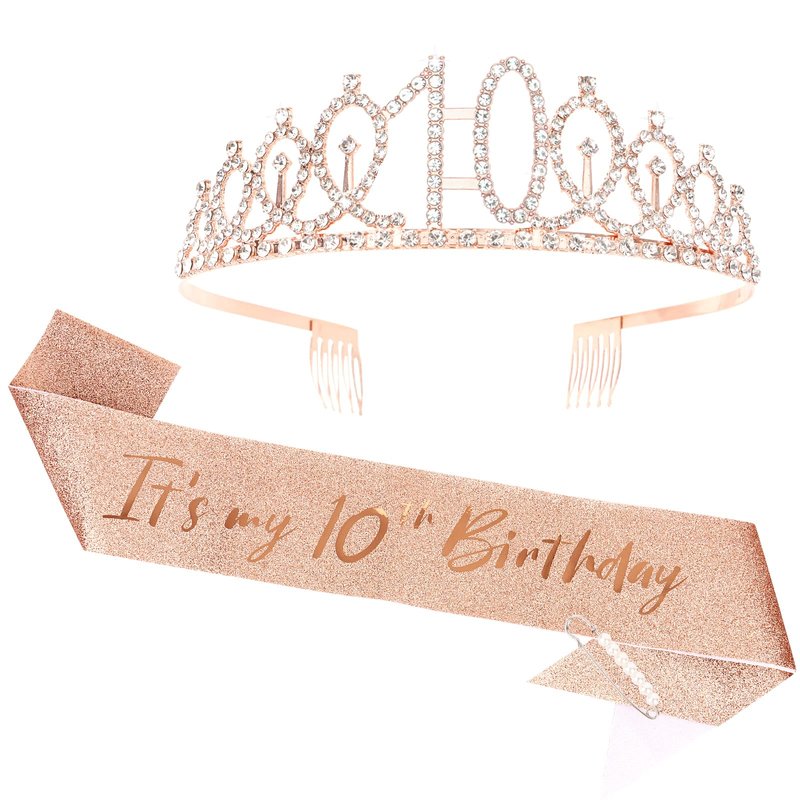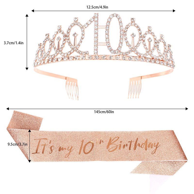 - 10th Birthday Set: The birthday kit includes "It's my 10th Birthday "sash, 10th rhinestone tiara and pearl pin. You will be like a queen in your birthday celebration
