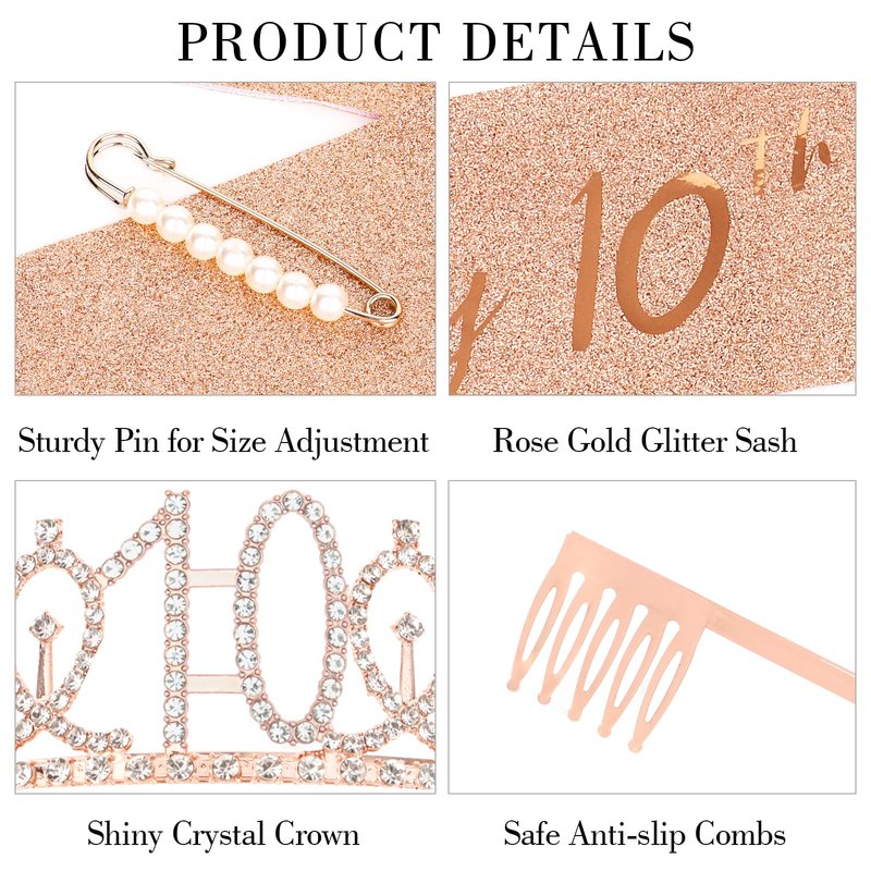 - 10th Birthday Sash: The sash is made from glitter fabric and printed with rose gold foil words. Elegant and gorgeous! The sash length is 30 inch when folded (total length is 60 inch), 3.7 inch width and comes with a pretty pearl pin. You can adjust the length by using the pearl pin