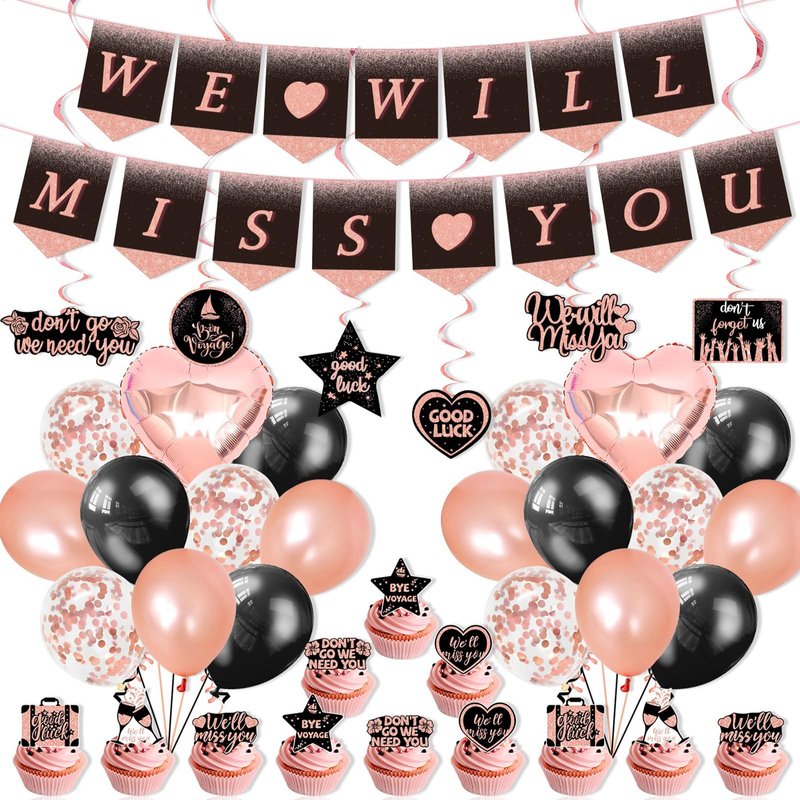 Rose Gold Farewell Party Decorations,We Will Miss You banner,Going away party decorations for Coworkers Goodbye, Rose Gold Hanging Swirls Balloon cupcake topper Decor Retired Party Supplies