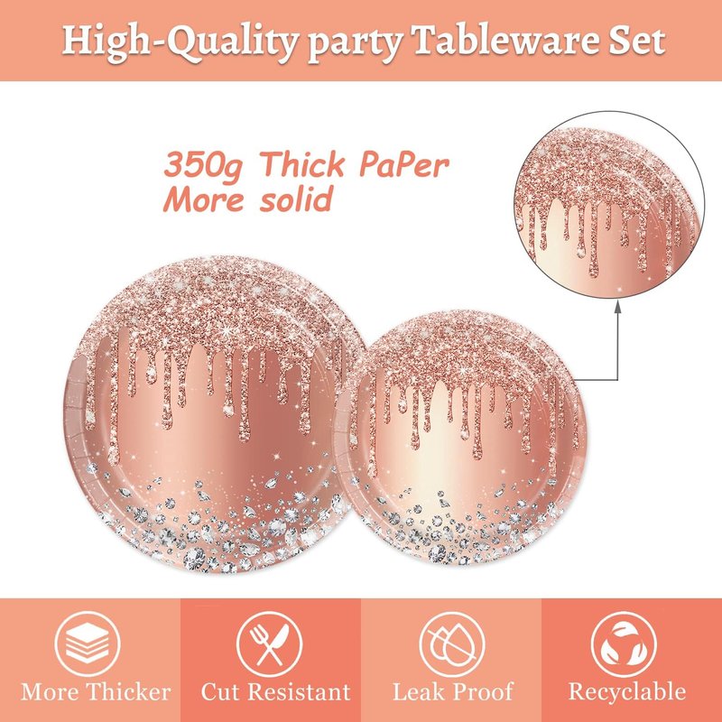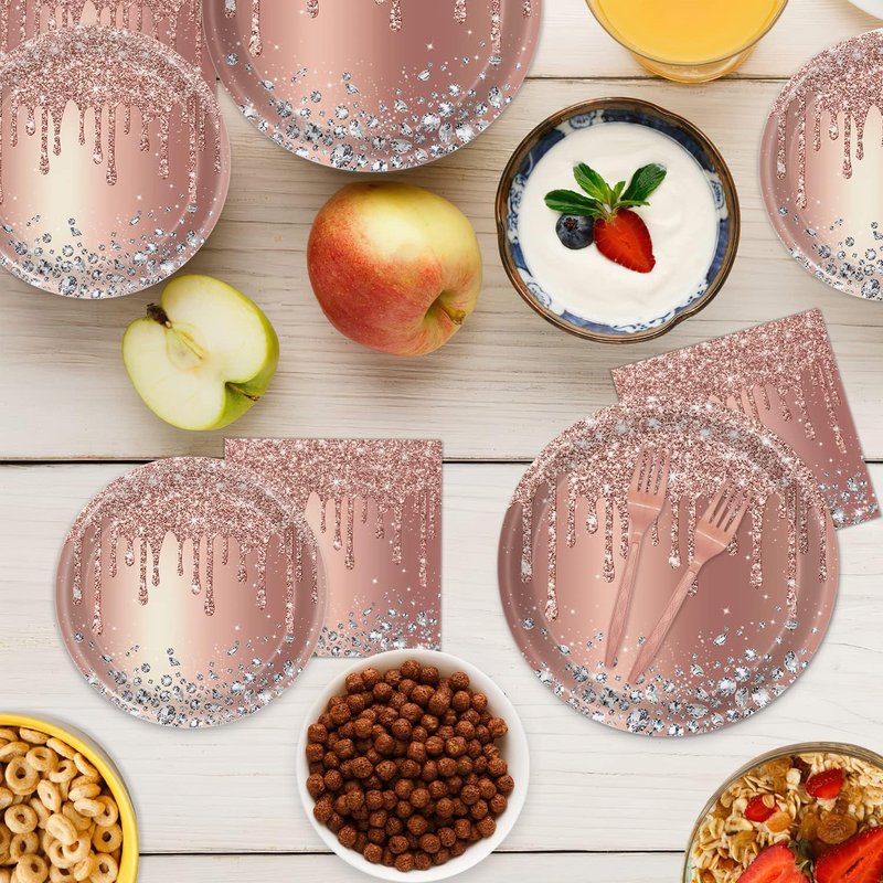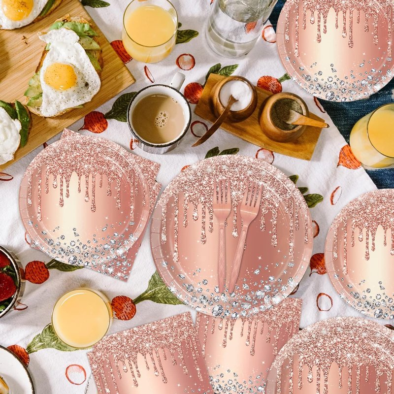 - 【Delicate design】:Enhance your anniversary birthday party or a friendly gathering with our exquisite tableware featuring a pink rose gold background adorned with delicate diamond patterns and a sparkling rose gold powder design. This elegant and charming tableware is the perfect choice to elevate the ambiance and create unforgettable moments for your special occasion.