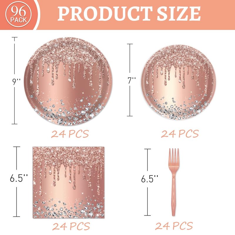 - 【Package Contents】:Transform your celebration with our Pink Rose Gold Birthday Party Set, designed to serve 24 guests. This comprehensive package includes 24 each of 7" dessert plates, 9" dinner plates, 6.5" napkins, and 6.5" forks. Elevate your party experience and make it truly memorable with our pink rose gold tableware.