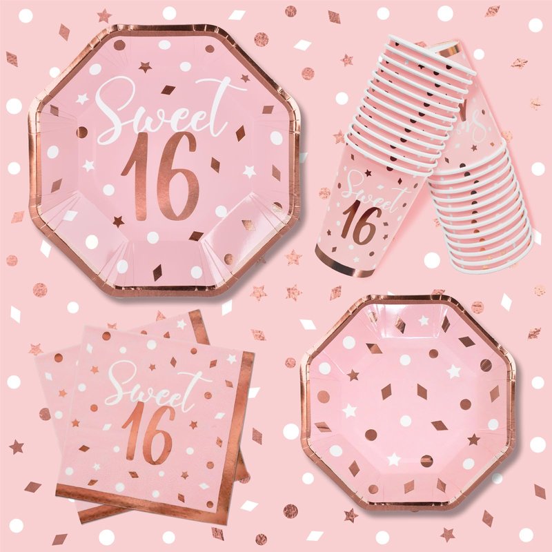 - Celebrate in Style with Our Exquisite Sweet 16 Party Decorations: This Birthday Package sets the stage for a remarkable Sweet 16 celebration, including 16*dinner paper plates (9 inches), 16*dessert paper plates (7inches), 16*napkins, 16*paper cups (12oz), Elevate your party with our metallic rose gold & pink themed tableware, designed to dazzle your guests and make clean-up a breeze.