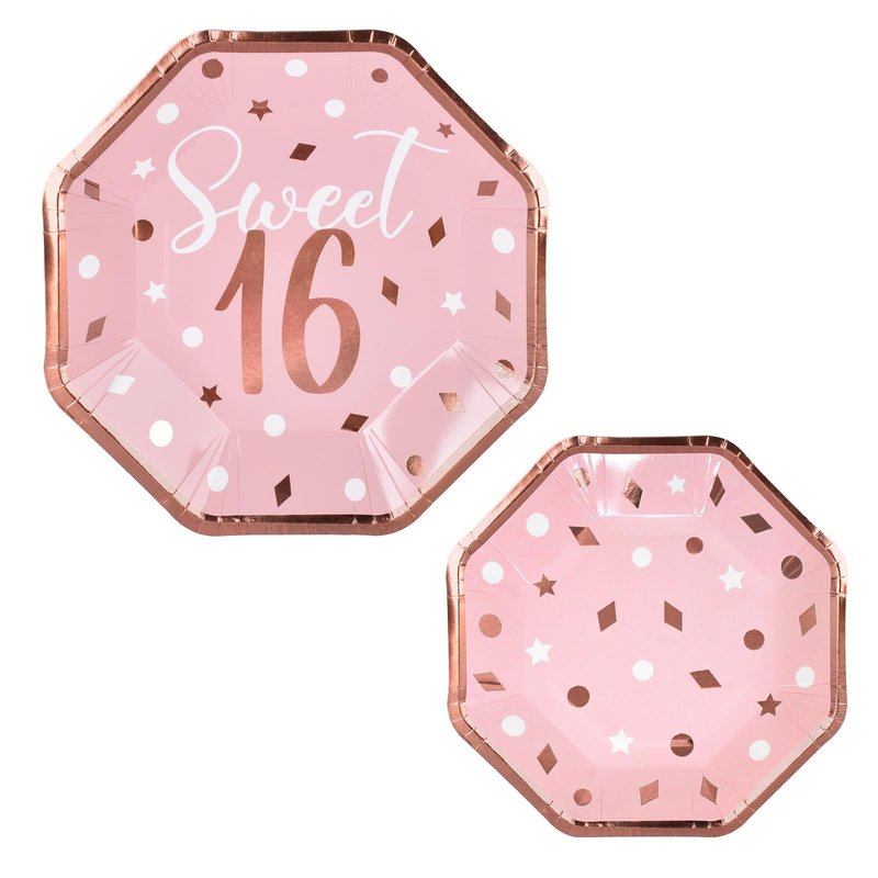 - Elegant & Convenient Dining Experience: Prepare your tables for that special day with our Metallic Rose Gold & Pink Sweet 16 Party Favors. Serve up elegance with our dinner and dessert plates featuring a chic "Sweet 16" message amidst shimmering diamond confetti. Ideal for serving hors d'oeuvres and sweet treats, our plates make post-party cleanup effortlessly stylish.