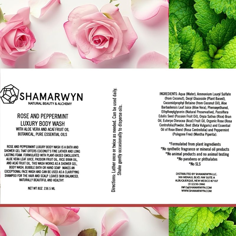 The Rose & Peppermint Luxury Body Wash creates a rich, luxurious lather that cleanses deeply, leaving your skin feeling refreshed and rejuvenated. Crafted with Aloe Vera Leaf Juice, Acaí Fruit Oil, and Passion Fruit Oil, it hydrates while soothing and balancing your skin.