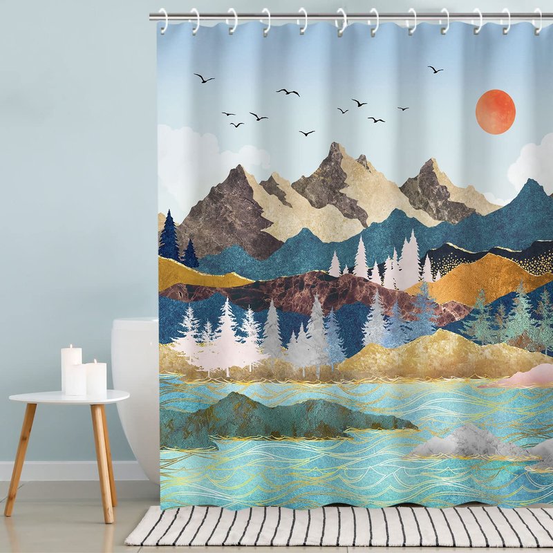 - Forest Shower Curtain: Reinforced top hem on the bottom prevents mountain curtains billowing keeping the water in and the cold air out. Super waterproof fabric is treated to let water beads stay on the surface, quick to repel and dry.