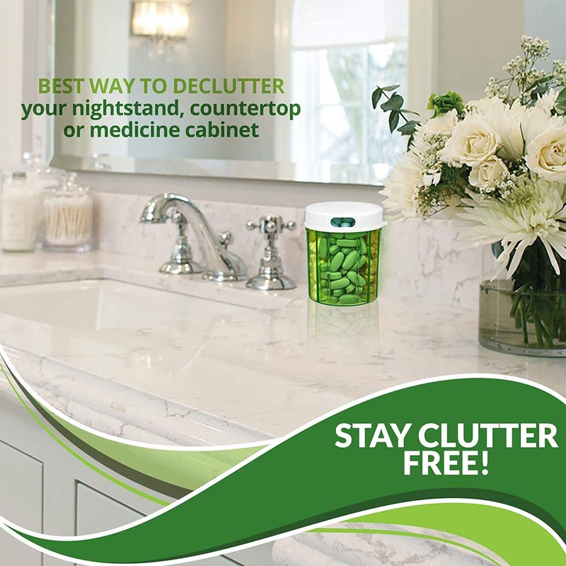 - CLEANS UP YOUR COUNTERTOP SPACE AND CABINETS: If you have been looking for a better way to declutter your nightstand, countertop or medicine cabinet and don't want to hide your pills in fear of missing a dose, Then this medication dispenser is the perfect solution! Thats because our product is large enough to hold up to 4 different types of medications or vitamins all in ONE convenient easy to use bottle so you can keep your medications right in your sight and stay clutter free!