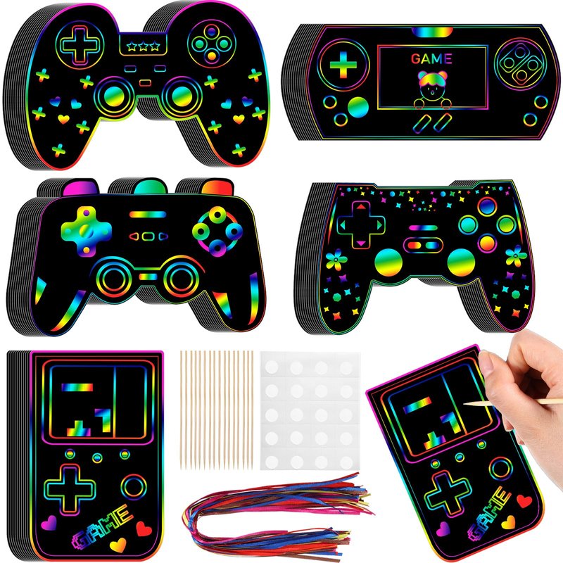 - Elegant Design and High Quantity: these video game shaped scratch off cards come in a pack of 60 featuring 5 different shapes, along with 30 sticks, 30 pieces of ribbons and 3 sheets of dot stickers; This impressive volume caters to your numerous gaming parties, ensuring a standout party experience