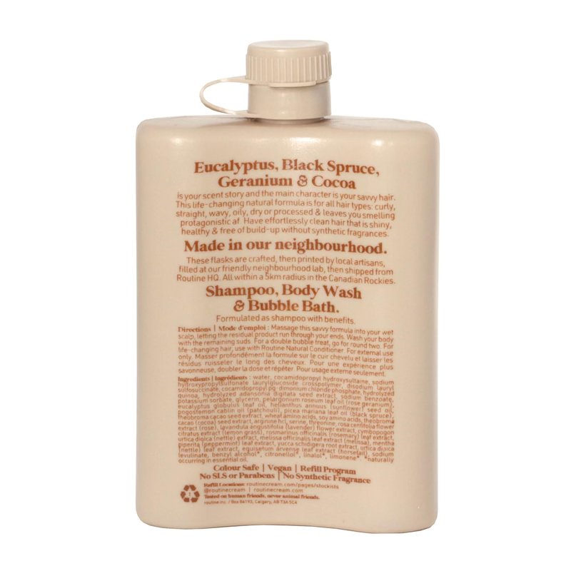Feed your head with vegetable based keratin and castor seed oil, which deliver intense moisture, a protective barrier, and enhance shine, elasticity, and strength. Astringent oils of eucalyptus & black spruce remove buildup, promoting lift from the roots. Cocoa, an antioxidant, limits free radicals and restores bounce. BOTANIC, AROMATIC & SAVVY Eucalyptus, Geranium, Black Spruce & Cocoa. THE SCIENCE BEHIND THE NATURE OF LOCKS THAT GROW AS QUICKLY AS WILDFLOWERS Routine’s Hair Systems were tested and perfected for five years before hitting the shelves, because good things take time. COLOUR SAFE | BOTANICALS | VEGAN | NO SLS OR PARABENS | NO SYNTHETIC FRAGRANCE