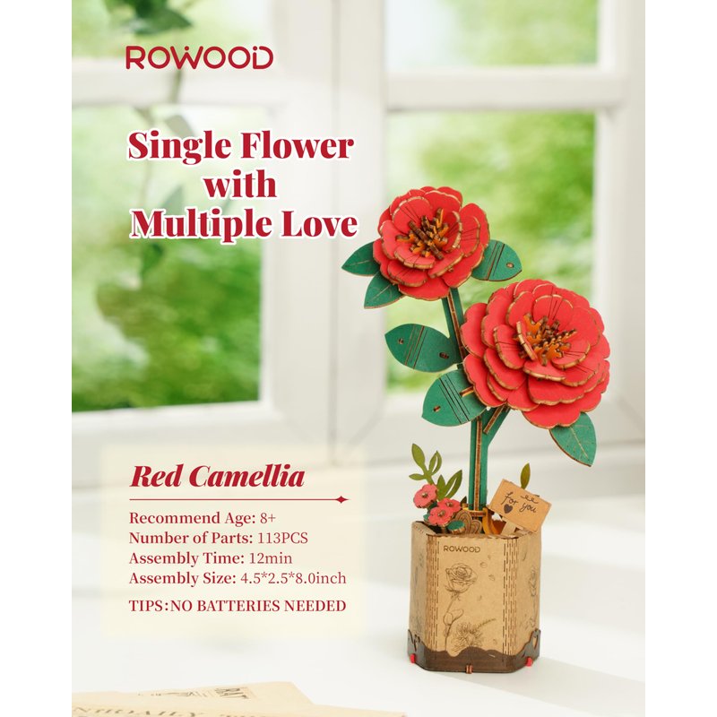 Rowood Artifical Flower-TW031 rowood diy miniature mini 3d botanical collection plant wooden puzzle craft model for mom mother children adults teens kids women grandma boys girls friends age 8+ as toy home decoration desk display birthday christmas gift Red Camellia