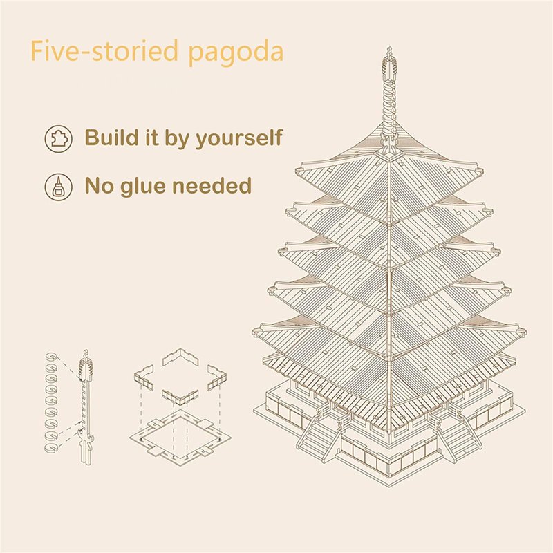 - [ All-In-One-Package ] - Detailed illustrated instructions, together with all necessary parts, and some spare parts. Which does a favor to you to better experience the fun of mortise and tenon craft during the assembly of the five-storied pagoda.