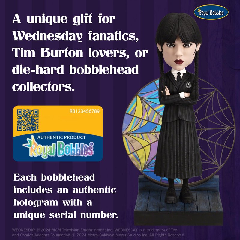 - WEDNESDAY BOBBLEHEAD: Bring home the dark charm of Wednesday Addams, portrayed by Jenna Ortega, from the hit Netflix series. In this unique piece, she stands in front of the stained-glass window of the room she shares with Enid Sinclair at Nevermore Academy.