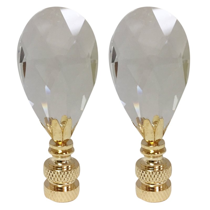 Royal Designs Radiant Teardrop 1.25" Clear Crystal Lamp Finial for Lamp Shade, Polished Brass Base - Set of 2