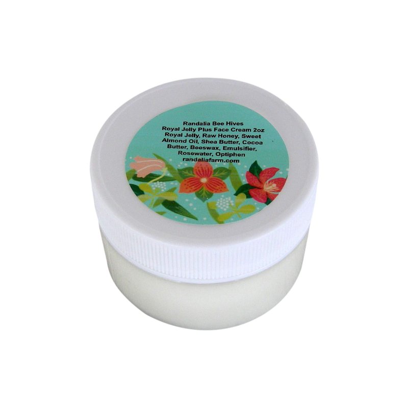 Royal Jelly Plus Raw Honey Face Cream. 4oz. Low Profile Plastic Jar with Screw on Lid. Ingredients are Pure Royal Jelly, Raw Maryland Wildflower Honey, Sweet Almond Oil, Shea Butter, Cocoa Butter, Beeswax, Emulsifier, Rosewater, Optiphen. Unscented. Moisturizer. Hand Crafted in Maryland, USA.
