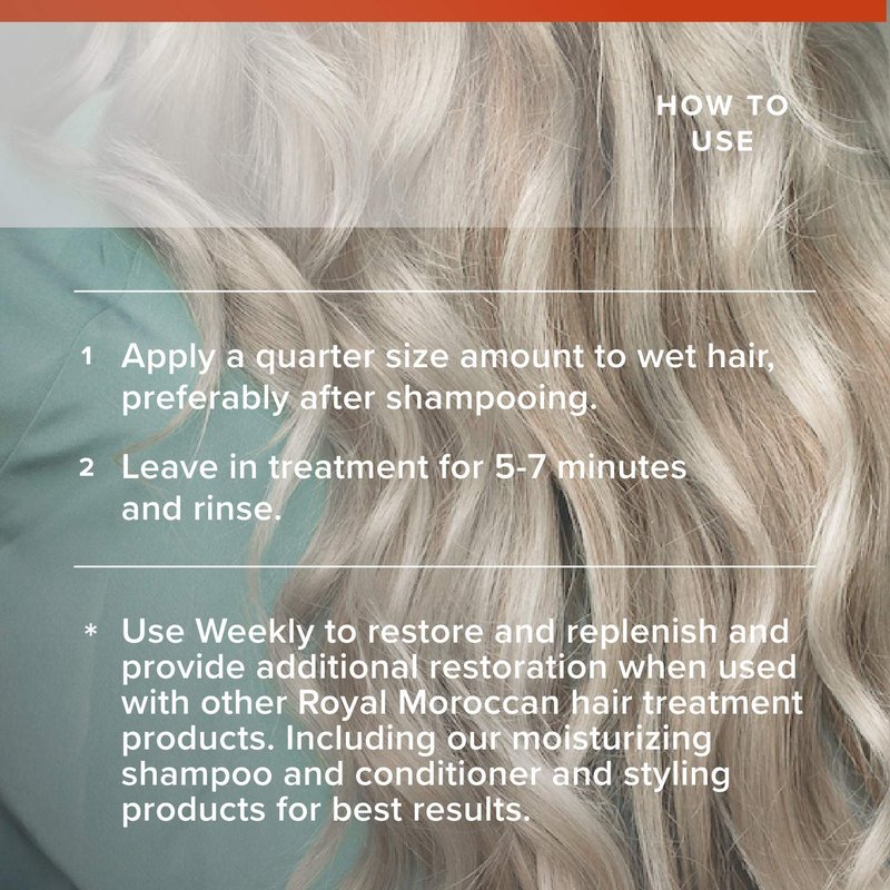 - UPDATE YOUR HAIR ROUTINE: Our Nourishing Mask treatment provides a salon experience in the convenience of your own home. Royal Moroccan mask strengthens brittle over processed hair. Apply a quarter size amount to wet hair, preferably after shampooing. Leave in treatment for 5-7 minutes and rinse. Use Weekly to restore and replenish and provide additional restoration when used with other Royal Moroccan hair treatment products.