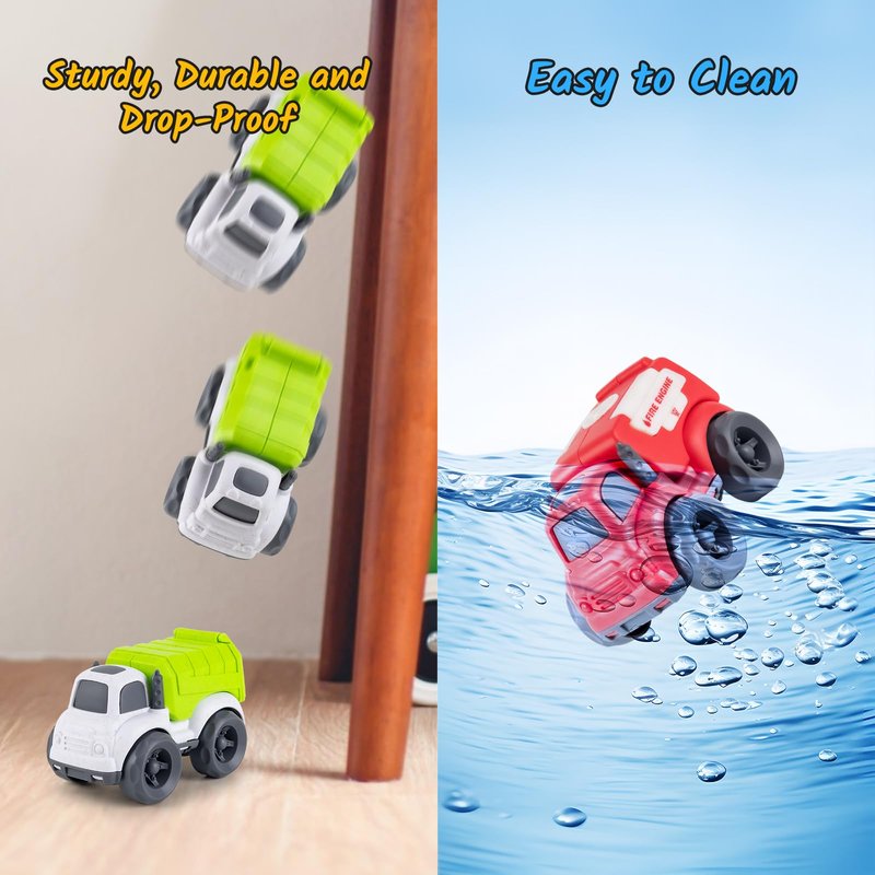 - 【Suitable for indoors and outdoors】 Perfect small size is convenient to take toy trucks anywhere. This truck toy set is not just for kids toddlers to play indoor, but also nice sand car toys for beach travel. With its special material, parents don't need to worry about cleansing. As long as the toy car is immersed in water or rinsed with cleanser, it can be restored to its new appearance.