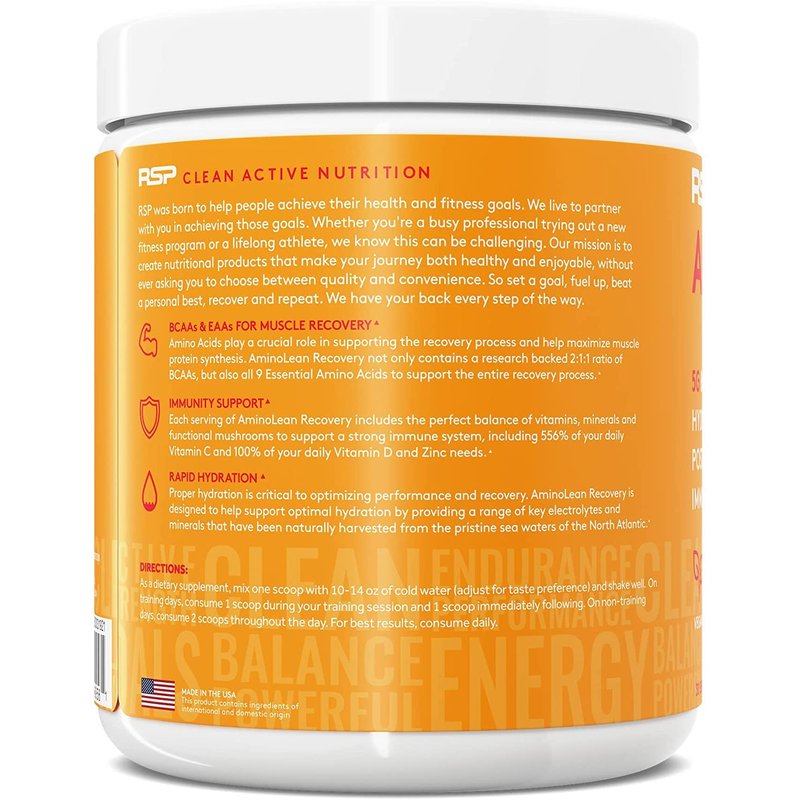 Dietary Supplement. Natural flavors. No artificial colors or flavors. 5 g BCAA + EAA. Vegan. Zero sugar. Hydrating electrolytes. Caffeine free. Clean active nutrition. Post workout recovery. Immunity support. 30 Servings. RSP was born to help people achieve their health and fitness goals. We live to partner with you in achieving those goals. Whether you’re a busy professional trying out a new fitness program or a lifelong athlete, we know this can be challenging. Our mission is to create nutritional products that make your journey both healthy and enjoyable, without ever asking you to choose between quality and convenience. So set a goal, fuel up, beat a personal best, recover and repeat. We have your back every step of the way. BCAAs & EAAs for Muscle Recovery: Amino Acids play a crucial role in supporting the recovery process and help maximize muscle protein synthesis. AminoLean Recovery not only contains a research backed 2:1:1 ratio of BCAAs, but also all 9 Essential Amino Acids to support the entire recovery process. Immune Support: Each serving of AminoLean Recovery includes the perfect balance of vitamins, minerals and functional mushrooms to support a strong immune system, including 556% of your daily Vitamin C and 100% of your daily Vitamin D and Zinc needs. Rapid Hydration: Proper hydration is critical to optimizing performance and recovery. AminoLean Recovery is designed to help support optimal hydration by providing a range of key electrolytes and minerals that have been naturally harvested from the pristine sea waters of the North Atlantic. www.rspnutrition.com. (These statements have not been evaluated by the Food and Drug Administration. This product is not intended to diagnose, treat, cure, or prevent any disease.) Made in the USA. This product contains ingredients of international and domestic origin.